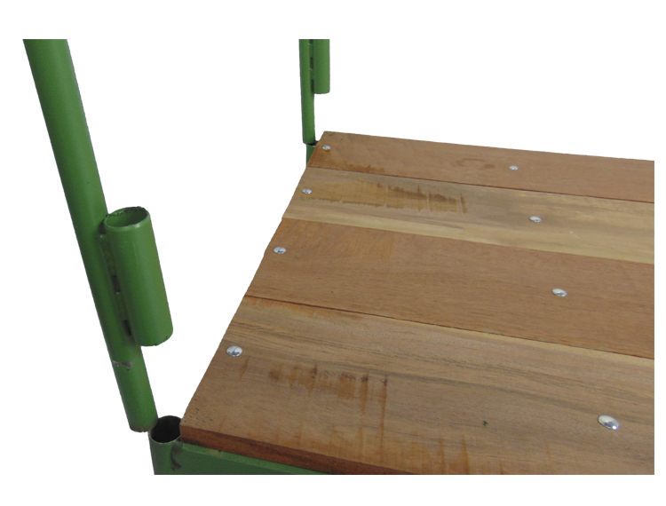 Carrinho Plataforma fabricado com assoalho de madeira de lei e com 4 abas removíveis. Possui sistema 5ª roda, dotado de cabo de tração em forma da “T” com articulação. Capacidade para 800 Kg. Equipado com 4 rodas pneumáticas (com câmara), sendo 2 montadas no eixo e 2 com freio montadas na “5ª roda”.