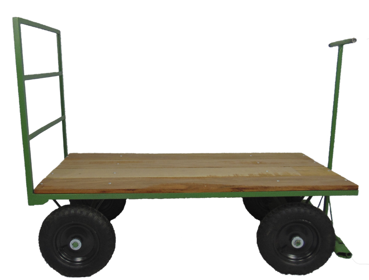 Carrinho Plataforma fabricado com assoalho de madeira de lei e com 1 aba fixa. Possui sistema 5ª roda, dotado de cabo de tração em forma da “T” com articulação. Capacidade para 800 Kg. Equipado com 4 rodas maciças.