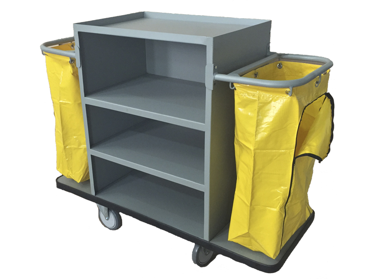 Carro/ Carrinho de hotel tipo camareira, arrumadeira, governança ou serviço de quarto com 3 compartimentos fechados nas laterais e fundos. Altura da primeira bandeja 28 cm e as demais 22 cm. Fabricado em aço com pintura epóxi de alta resistência.  Acompanha 2 sacos em vinil com capacidade de 90 litros cada. Equipado com 4 rodízios de 6” sendo 2 fixos e 2 giratórios. Possui 140 cm de comprimento, 50 cm de largura e 100 cm de altura.