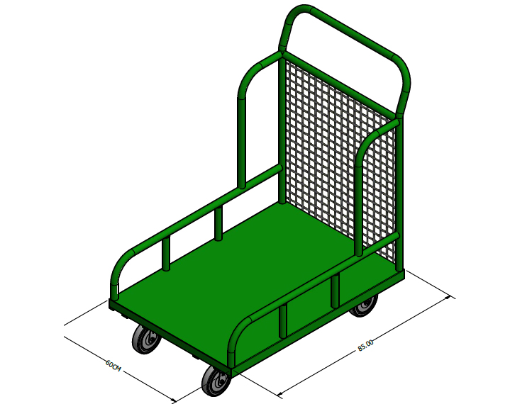 Carro/ Carrinho picking em plataforma de chapa com abas laterais fixas. Capacidade para 300 Kg. Equipado com 4 rodízios de 5”, sendo 2 fixo e 2 giratórios. Possui 85 cm de comprimento, 60 cm de largura, com pegador em tubo e tela com 100 cm de altura.
